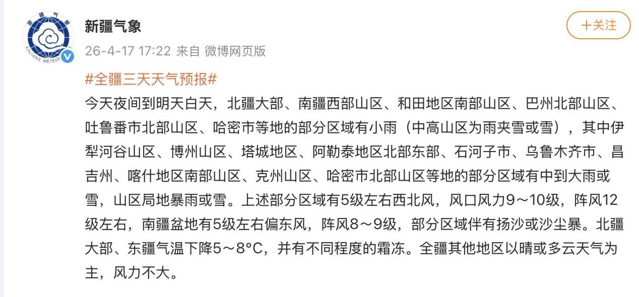 另据乌鲁木齐晚报消息,17日夜间,乌鲁木齐市大部区域有小到中雨,水磨沟区山区、米东山区和达坂城区北部山区中到大雨,南郊大雨转雨夹雪,南山山区中雨转雨夹雪转中雪,局地暴雪,上述区域伴4级至5级西北风,达坂城区小雨伴10级至11级偏西阵风,城区气温8℃至17℃。