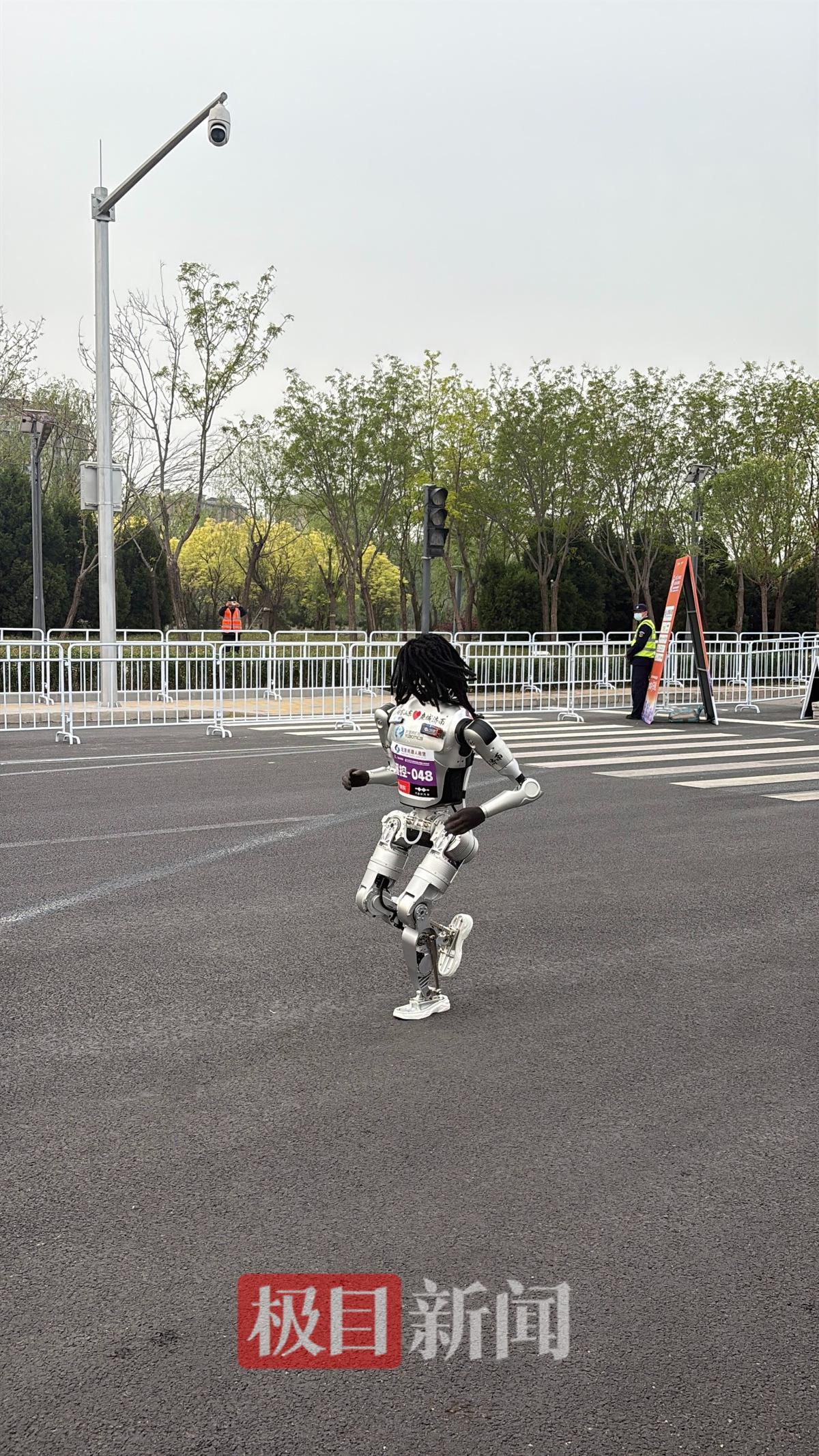 极目新闻记者在现场看到,比赛采用人机共跑模式,人类选手与机器人选手共用赛道,通过铁马护栏或绿化带隔离。赛场上出现有趣一幕:率先出发的几台机器人速度飞快,人类选手追着机器人跑。现场机器人的跑姿也不尽相同,有的身体前倾,有的“坐着”跑。