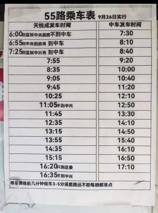 松原公交55路车内张贴的时刻表(图片来源:大风新闻)