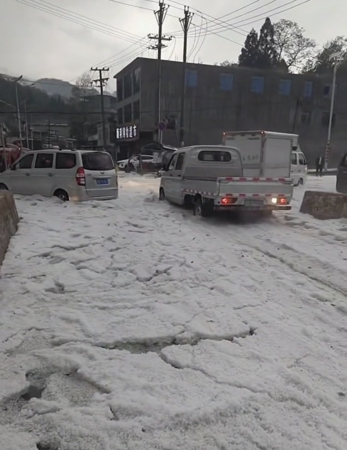视频显示,街道上的冰雹堆了厚厚一层,车辆轮胎陷入冰雹中无法动身,晚上有铲车清理街道上的冰雹。