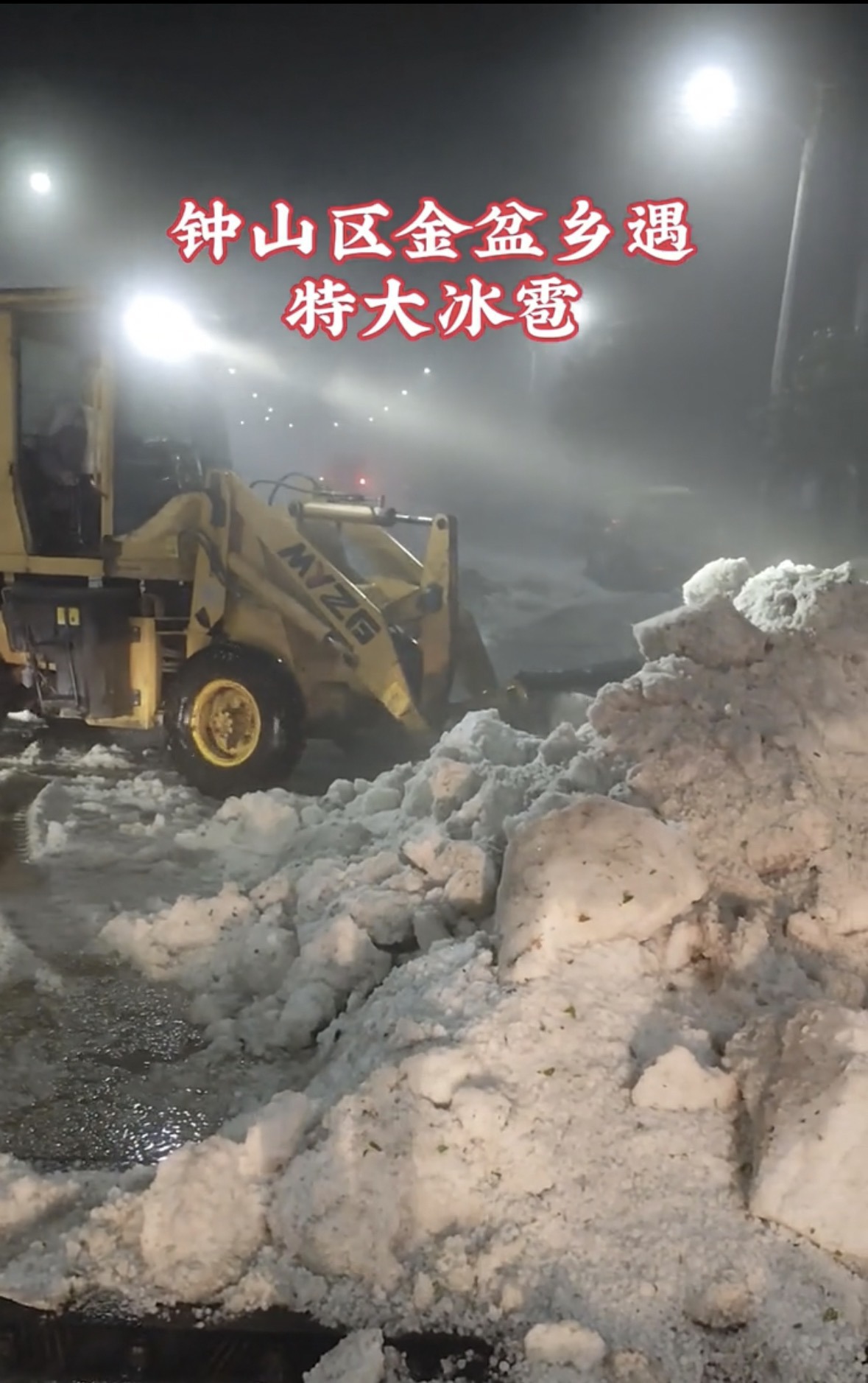 金盆乡政府工作人员向记者介绍,4月19日当地突降冰雹,出动了铲车和人员清理街道上堆积的冰雹,受灾情况有关部门还在统计当中。