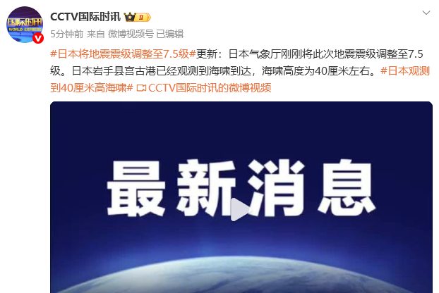 日本将地震震级调整至7.5级,海啸高度为40厘米左右