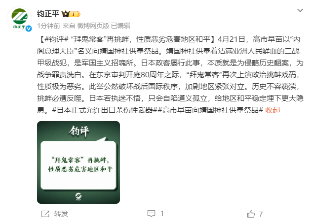 4月21日,钧正平发文:4月21日,高市早苗以“内阁总理大臣”名义向靖国神社供奉祭品。靖国神社供奉着沾满亚洲人民鲜血的二战甲级战犯,是军国主义招魂所。日本政客屡行此事,本质就是为侵略历史翻案,为战争罪责洗白。在东京审判开庭80周年之际,“拜鬼常客”再次上演政治挑衅戏码,性质极为恶劣。此举公然破坏战后国际秩序,加剧地区紧张对立。历史不容亵渎,挑衅必遭反噬。日本若执迷不悟,只会自陷道义孤立,给地区和平稳定埋下更大隐患。