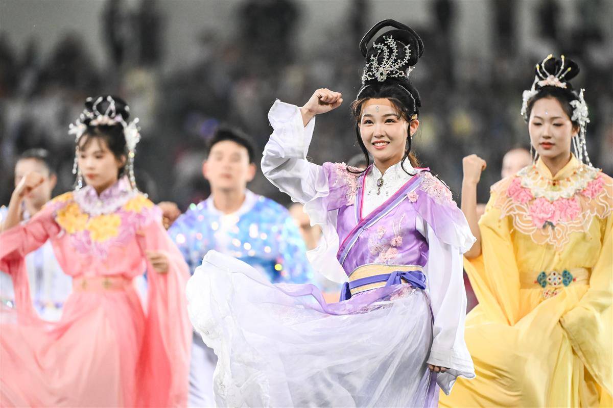 4月18日,“楚超”首轮黄冈队主场对阵神农架队的比赛中场,黄梅“仙女”拉拉队跳舞助阵楚超。(湖北日报全媒记者 任勇 摄)
