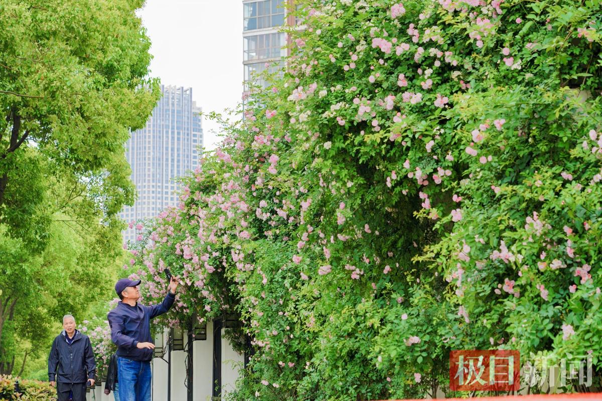 4月21日,武汉市汉阳区晴川大道上,一片绵延百米的蔷薇花墙正值盛花期。粉白相间的花朵密密匝匝,如瀑布般倾泻而下,为城市街道披上了一层浪漫的春装,市民和游客漫步其间,仿佛步入一条流动的鲜花瀑布。