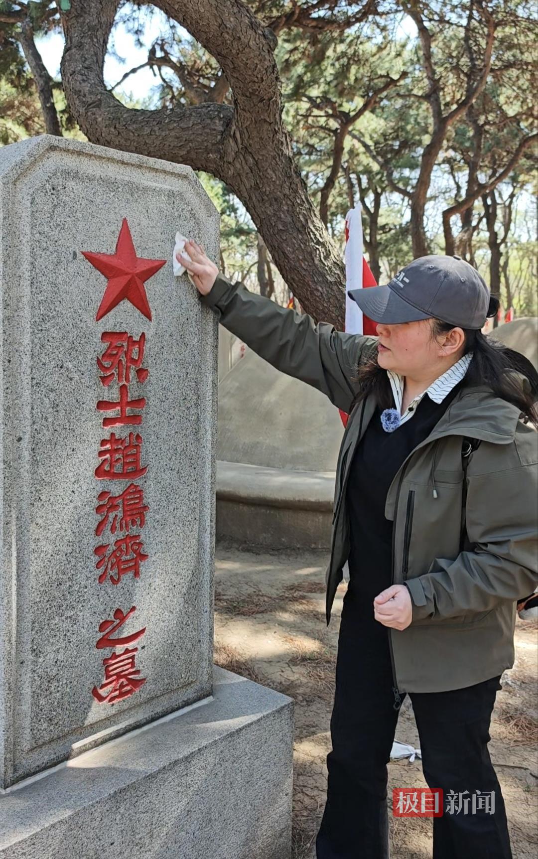 孙嘉怿在陵园内擦拭墓碑