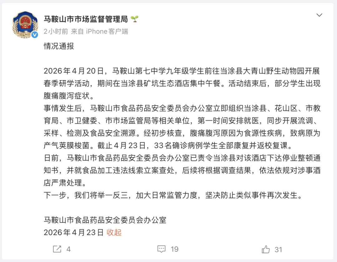 事情发生后,马鞍山市食品药品安全委员会办公室立即组织当涂县、花山区、市教育局、市卫健委、市市场监管局等相关单位,第一时间安排就医,同步开展流调、采样、检测及食品安全溯源。经初步核查,腹痛腹泻原因为食源性疾病,致病原为产气荚膜梭菌。截至4月23日,33名确诊病例学生全部康复并返校复课。