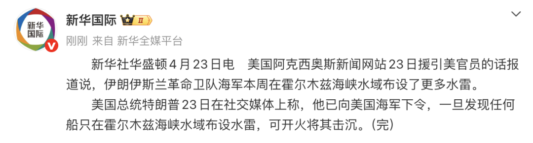 美国总统特朗普23日在社交媒体上称,他已向美国海军下令,一旦发现任何船只在霍尔木兹海峡水域布设水雷,可开火将其击沉。