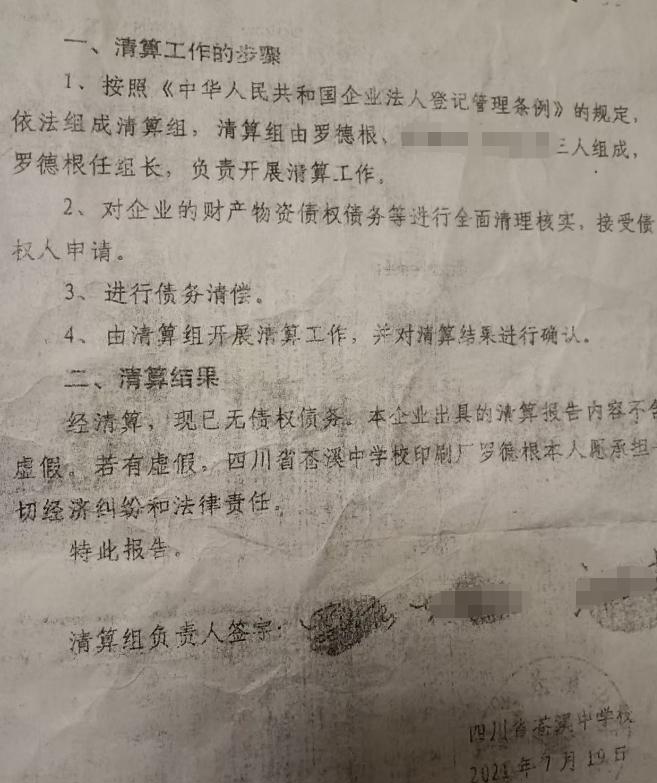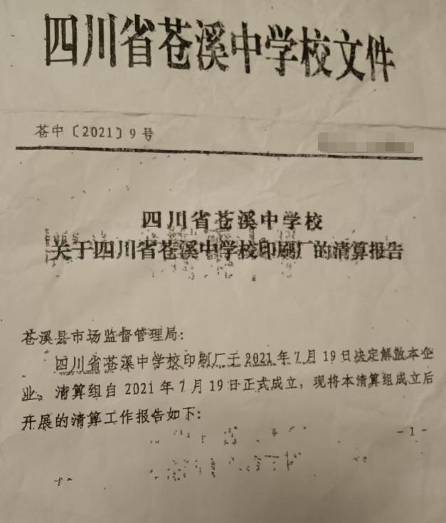 苍溪县法院一审判决书显示,1984年,苍溪中学校根据国家勤工俭学政策,申请成立集体所有制校办工厂;1985年5月,更名为四川省苍溪中学校印刷厂。1991年,经苍溪县文教局审批同意,苍中印刷厂经济性质变更为全民所有制。2007年,苍中印刷厂增加注册资本70万元,工商行政管理局颁发的企业法人营业执照载明其经济性质为集体所有制。2019年7月,苍中印刷厂停产停业;2021年9月,该厂被注销。