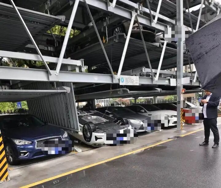 据杭州都市快报报道,目击者称,4月23日上午,上城区政务服务中心立体车库中有一辆宝马车突然坠落,伴有巨响。现场图片显示,一辆车侧翻躺在立体车库一层,托盘整体垂直挂在链条上。24日上午,记者探访该单位发现,两个立体车库均已停用,正在检修,停车只能停在地面。
