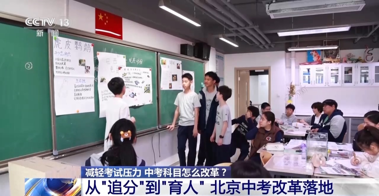 中考导向的转变让课堂释放出自由探索的活力。在北京十一实验中学的生物课上,记者看到,虎皮鹦鹉、巴西龟等小动物成为学生们课桌上的主角。这节以“观察动物”为主题的课上,学生们分组观察、记录小动物的习性,并上台分享自己的发现与思考。