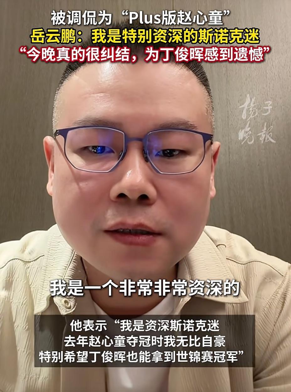 演员岳云鹏在谈到丁俊晖与赵心童的比赛时,称特别希望丁俊晖能拿到世锦赛冠军,赵心童去年拿到世锦赛冠军自己非常激动,无比骄傲。