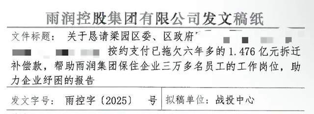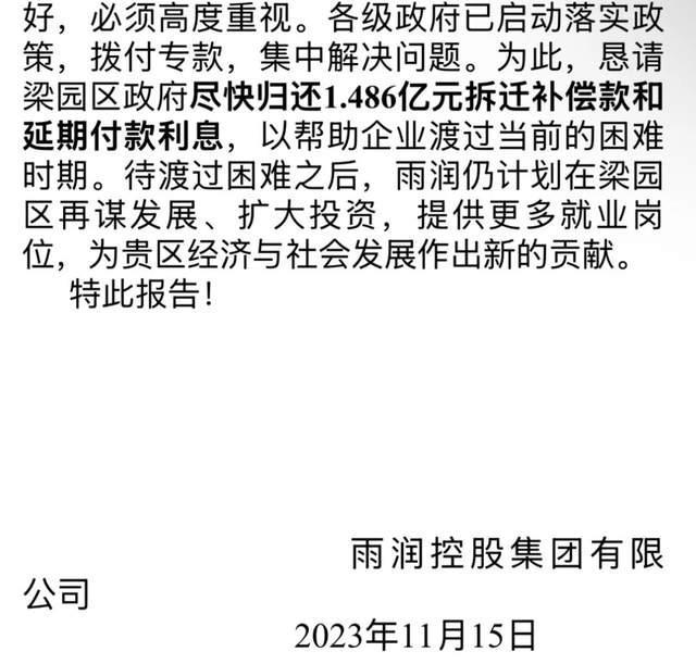 2023年底,雨润集团向梁园区政府发函,希望有关部门归还补偿款(图片来源:大风新闻)