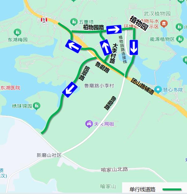 (2)植物园路实行由北向南(鲁磨路至团山路)单向通行;