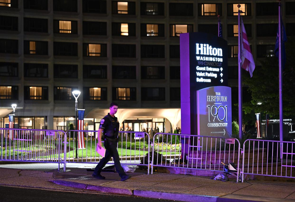 4月25日,一名警察走在举行白宫记者协会晚宴的美国华盛顿希尔顿酒店附近。新华社记者李睿摄