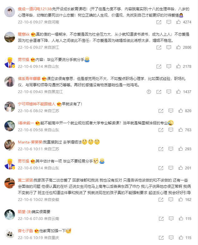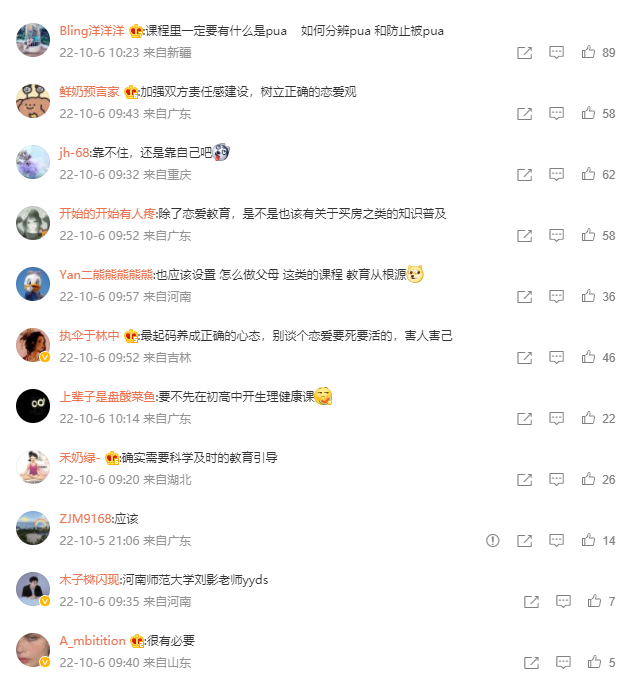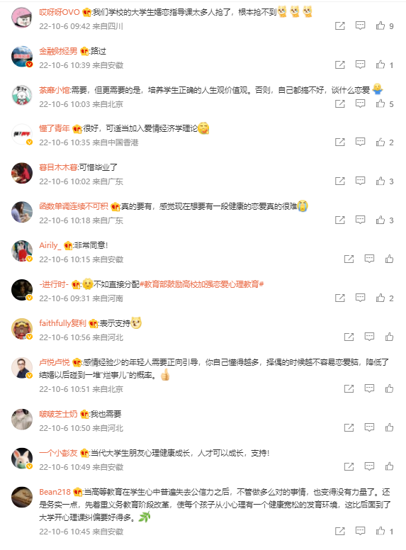 【教育部鼓励高校加强恋爱心理教育,近九成大学生支持开设恋爱课】 近日,教育部答复全国人大代表建议时表示,鼓励高校加强恋爱心理教育、家庭伦理教育,提升学生表达、沟通和交往能力,引导学生树立正确的爱情观、婚恋观、家庭观。一项调查显示,88.23%的大学生支持开设恋爱课。去年,@武汉大学 喻丰教授开设的“恋爱心理学”讲座,十分火爆。受访高校教师表示,高校开设恋爱心理、婚姻家庭课程,充分回应了学生刚需。