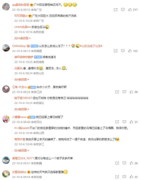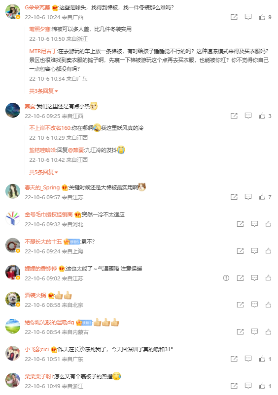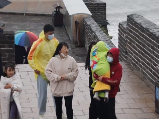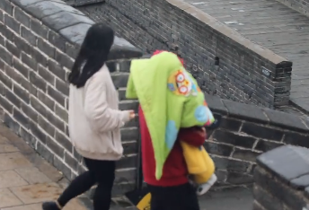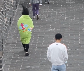 【气温骤降女子裹棉被逛景区】 10月3日,河北秦皇岛。全国部分地区开始断崖式降温,一风景区内的女子将棉被裹在身上行走,随后又将棉被给孩子裹上。拍摄者杨女士介绍,当时天气非常冷,最低气温8摄氏度,这位女士太机智了。