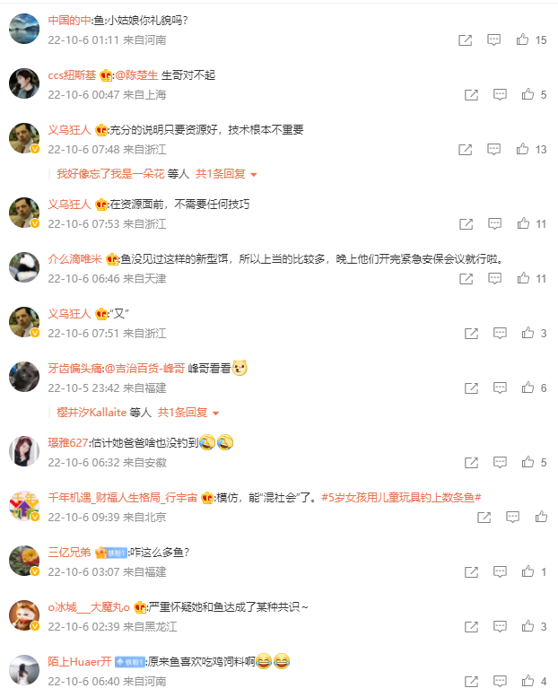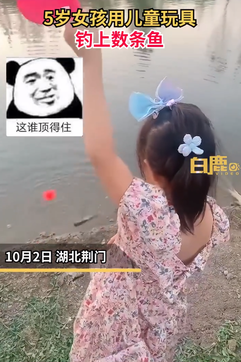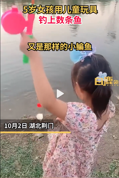 【新手保护期?5岁女孩用儿童玩具钓上数条鱼,妈妈:有没有好装备不重要,重要的是能钓到鱼】10月2日,湖北荆门。5岁女孩跟着爸爸一起钓鱼,女孩用自己放风筝的玩具杆绑上鸡饲料学爸爸钓鱼,没想到不到一个小时竟钓上来好几条鱼。孩子妈妈表示,孩子爸爸非常喜欢钓鱼,有时候孩子就会跟着一起,耳濡目染学会了。当时看到这一幕觉得很有趣,感叹道:“有没有好装备不重要,重要的是能钓到鱼!