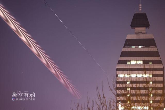 这是北京市天文摄影爱好者王俊峰2023年2月22日在北京市西城区拍摄的金星伴月牙(多张轨迹叠加)。(本人供图)