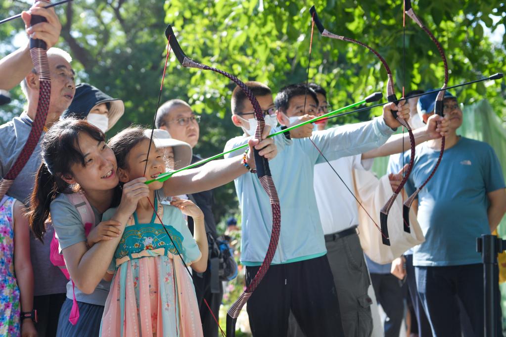 6月22日,小朋友和家长一起在北京龙潭公园体验射五毒。新华社记者鞠焕宗摄