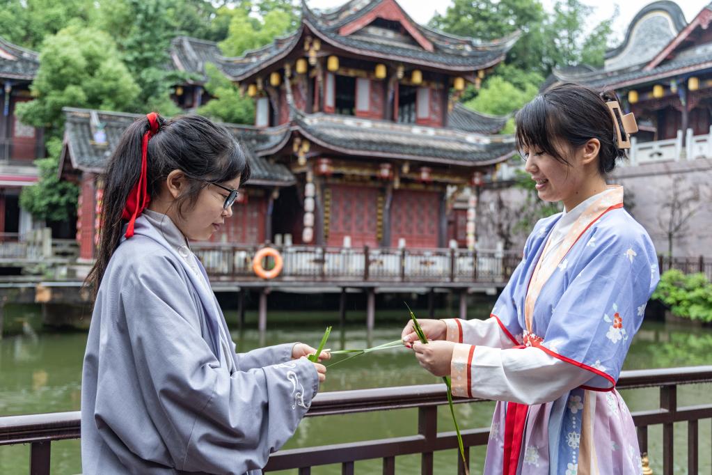6月21日,在重庆市璧山区秀湖公园内的九门仙侠小镇,游客身穿汉服体验斗草游戏。新华社记者黄伟摄