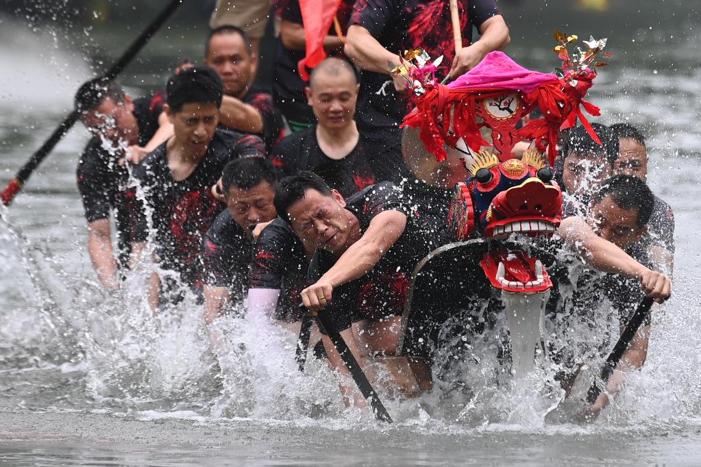 6月22日,村民在杭州西溪国家湿地公园的蒋村龙舟胜会上划龙舟。新华社记者黄宗治摄