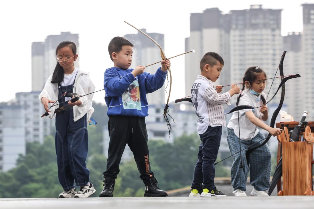 2022年6月3日,在贵州省贵阳孔学堂举行的端午活动上,几名小朋友在体验“射五毒”。新华社记者欧东衢摄