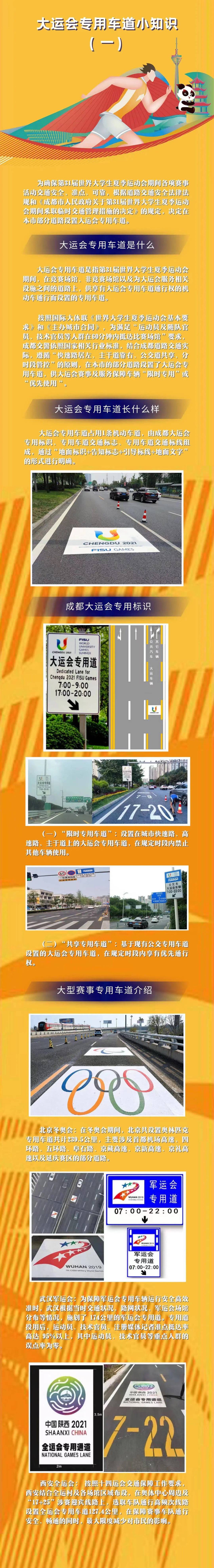 7月15日,记者从成都市公安局获悉,大运会专用通道将在部分城市道路和三环路、绕城高速进行施划,其中城市道路优先利用原公交专用车道标线,同时在路口出口设置一面大运会专用道标志和对应的地面标识及时间标识,路口进口的地面增设“大运车辆”地面文字标线,以下是大运会专用车道的“小知识”。