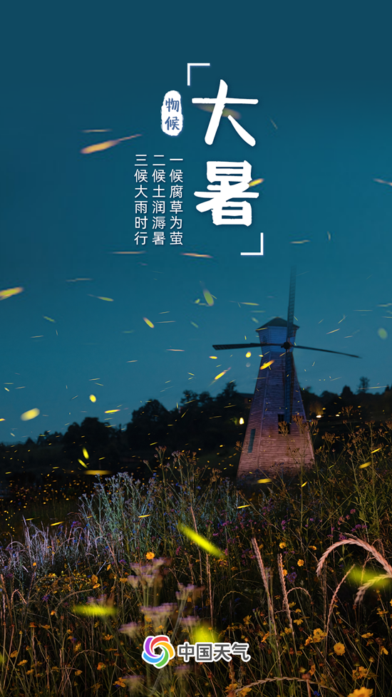 大暑有三候:一候腐草为萤,二候土润溽暑,三候大雨时行。每到大暑时节,由于气温偏高又有雨水,细菌容易滋生,许多枯死的植物潮湿腐化,到了夜晚,经常可以看到萤火虫飞来飞去寻找食物。另外土地潮湿,适宜水稻等喜水作物的生长。在这雨热同季的潮热天气,时常会有大雨落下。