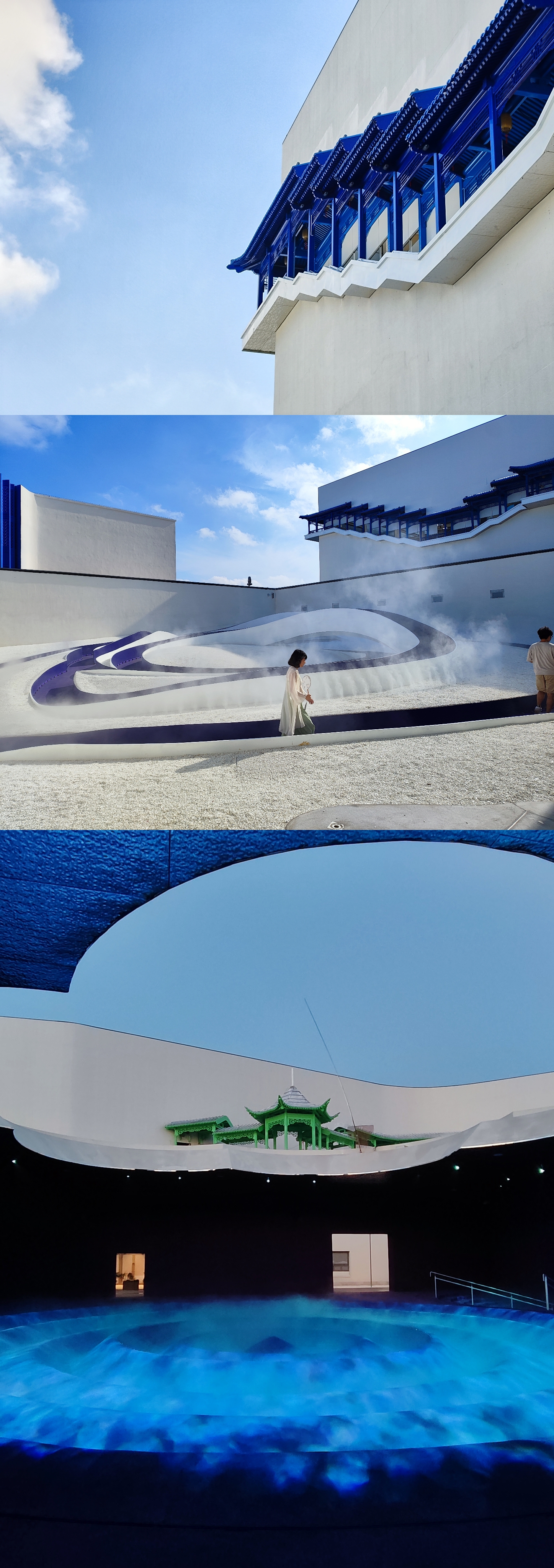 在戏剧幻城中行走的确总有误入幻境的迷乱之感,设计中先是做了减法——不再用非常繁复多样的配色,所有的墙几乎都是白色,地面也辅之以白色的石粒、细沙,建立一种独属于“幻境”的虚空、纯然之感,在这基础上,似乎为了营造一种陌生感和玄幻感,游廊不再只是盘亘在地上,而是“浮”在空中,其色彩也不是我们熟悉的朱红和彩绘,而是被简化为一种我们并不熟悉的游廊与楼阁的样貌——它有时是一种很苍翠的绿,有时是一种很浓郁的蓝,极简、奇怪、新奇,但很动人。