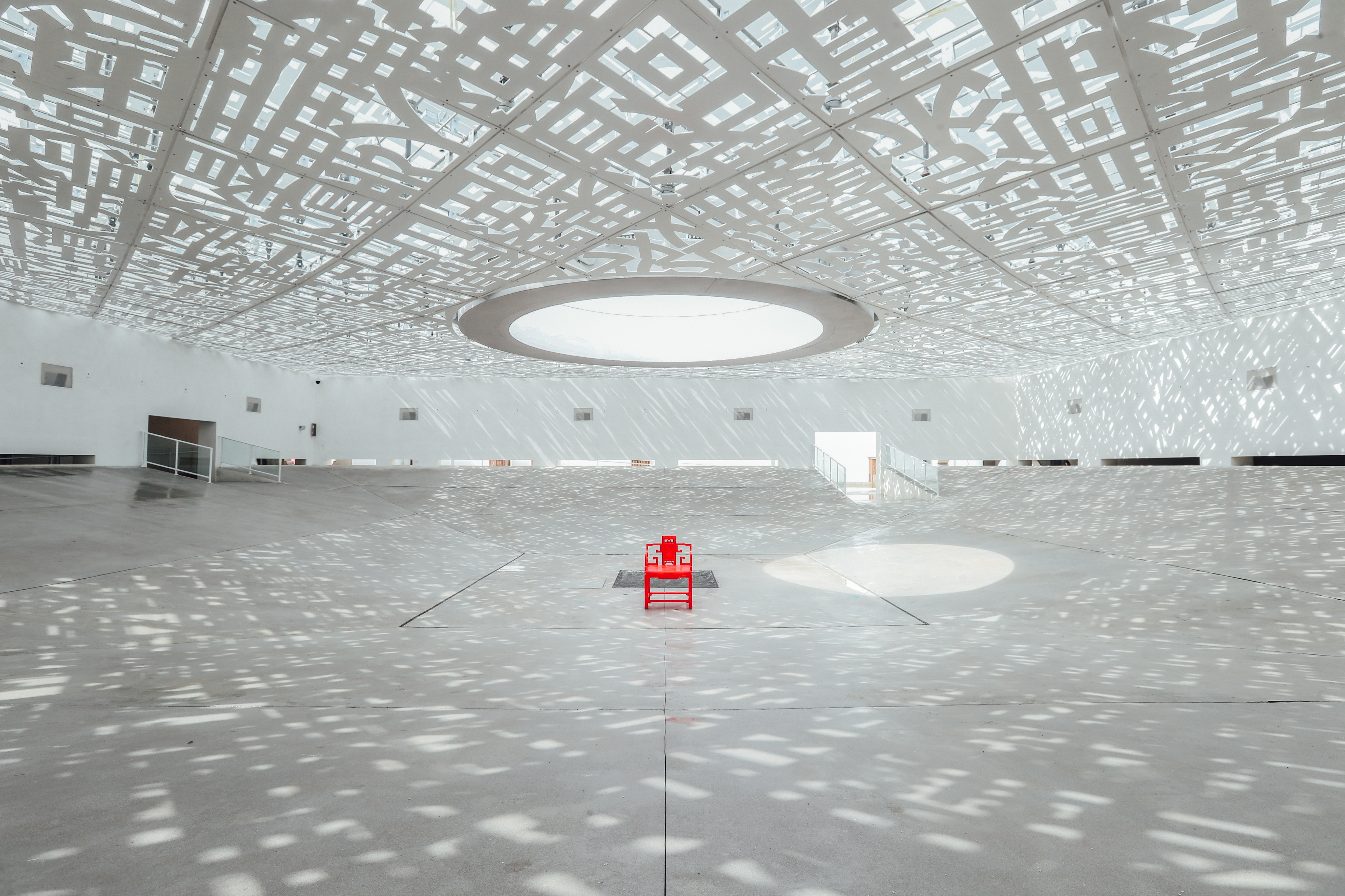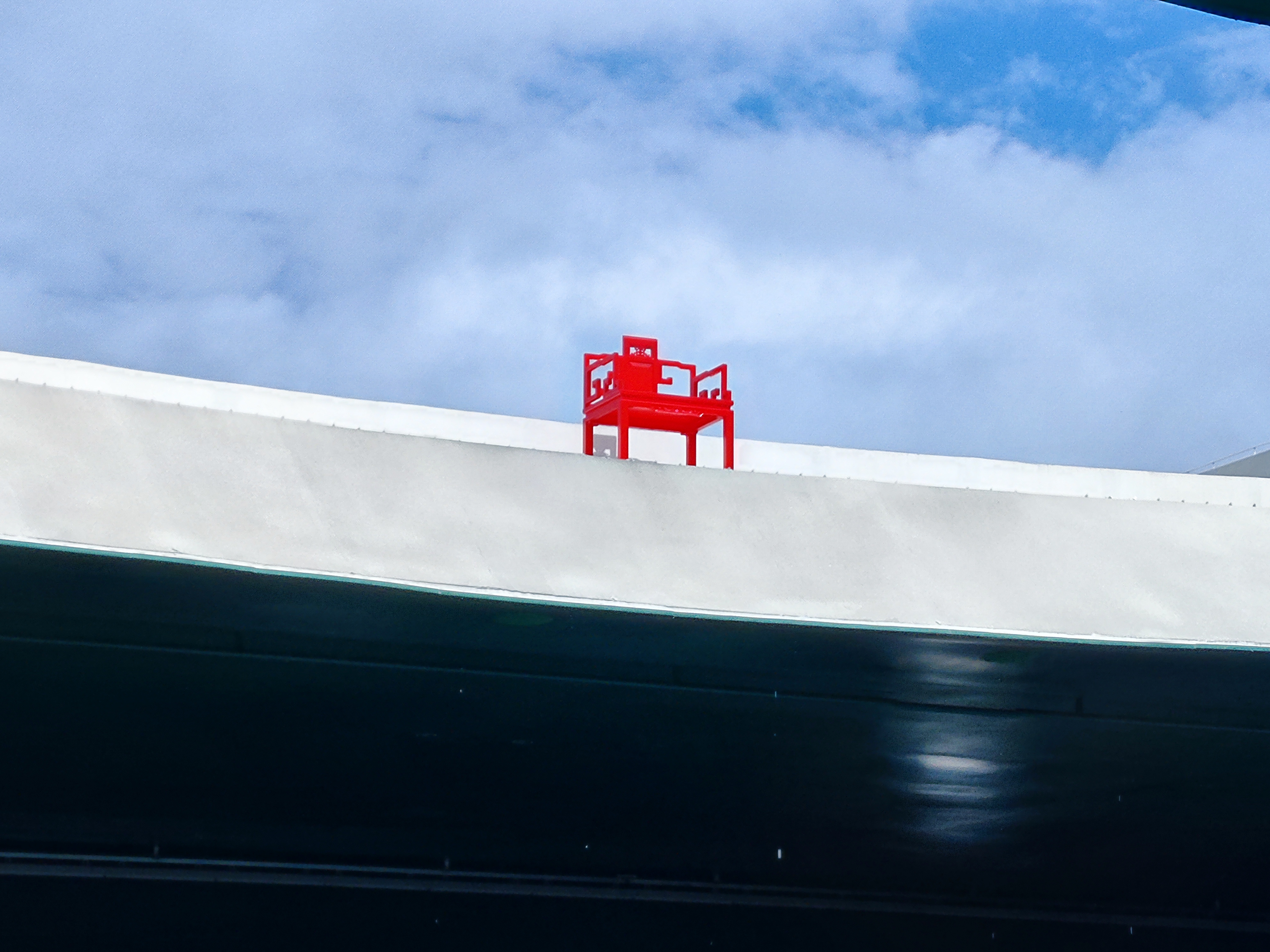 戏剧幻城里也有着夸张的“空”和“满”,戏剧幻城中一个最主要的视觉是一把空的红色椅子,它被安置在园林的各个地方,有时它会出现在一个非常空的巨大空间里,显得很渺小,有时候也会高居于一个空间的上方,大尺幅的空间和这样一个小的、空的抽象物的对比让人印象深刻。