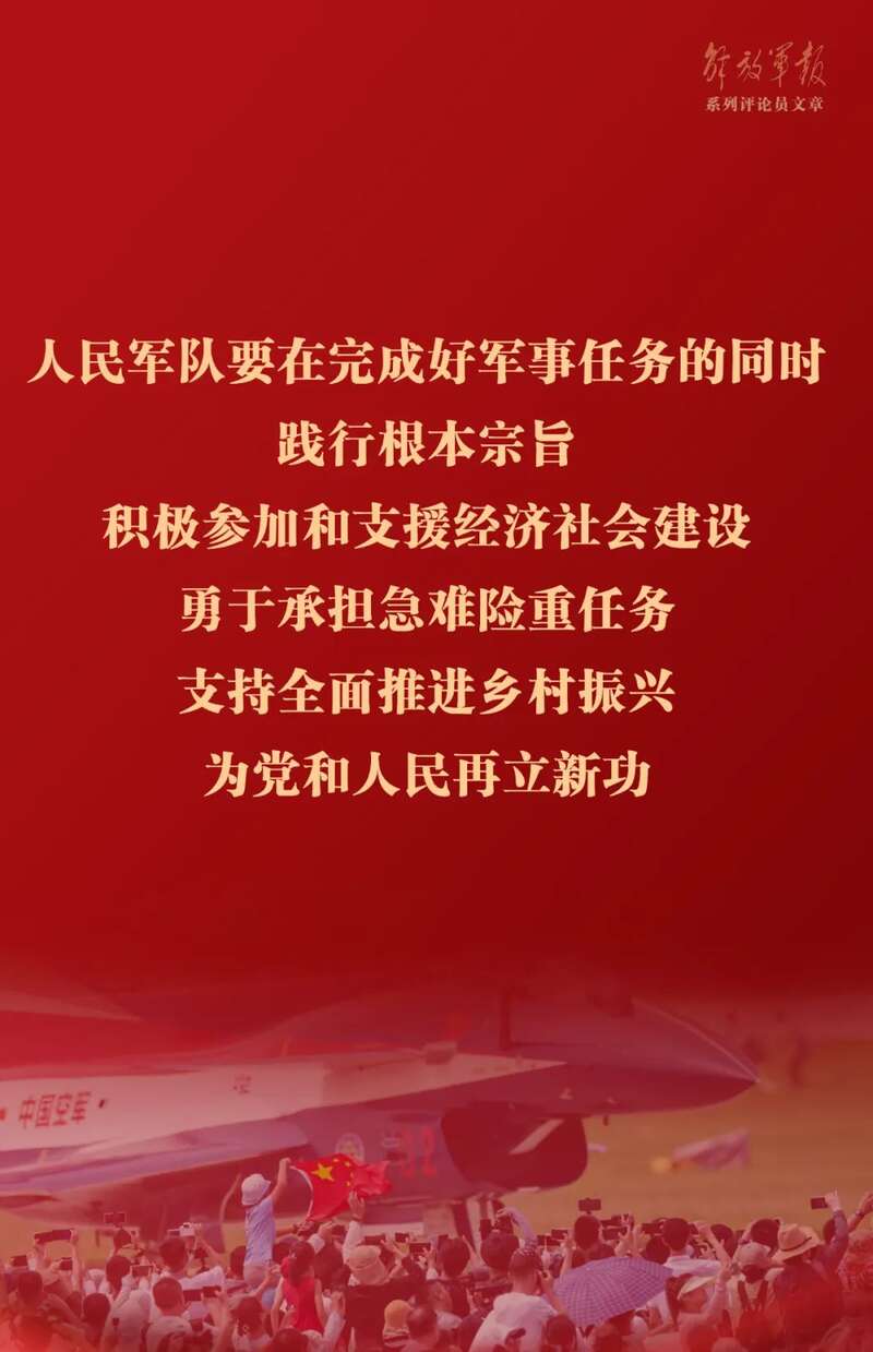 军政军民团结是实现富国和强军相统一的重要政治保障,是我们党和国家的显著政治优势。要弘扬拥政爱民、拥军优属光荣传统,巩固发展新时代军政军民团结,在全社会营造关心国防、热爱国防、建设国防、保卫国防的浓厚氛围,为巩固提高一体化国家战略体系和能力、为推进强国强军汇聚强大力量。人民军队要在完成好军事任务的同时,践行根本宗旨,积极参加和支援经济社会建设,勇于承担急难险重任务,支持全面推进乡村振兴,为党和人民再立新功。