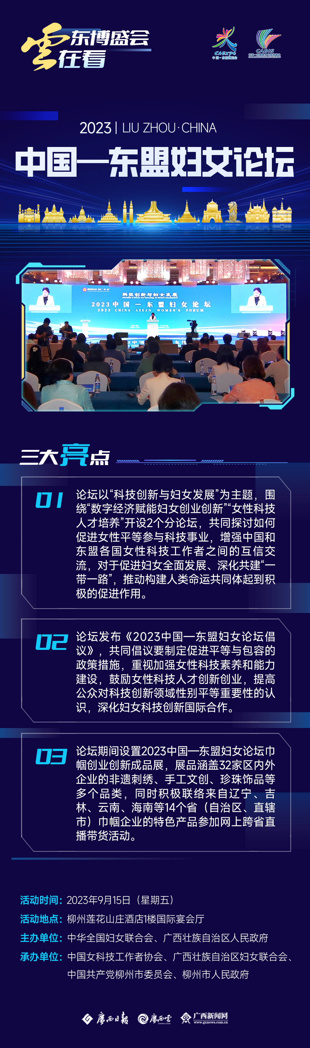 本届论坛是第二十届中国—东盟博览会高层论坛之一,由全国妇联、自治区人民政府主办,中国女科技工作者协会、自治区妇联、中共柳州市委、柳州市人民政府联合承办。论坛邀请了中国、东盟各国及东帝汶的妇女事务官员、驻华使领馆官员、女科技工作者、女企业家、女能人、女留学生、妇女工作者等250多人出席,围绕“数字经济赋能妇女创业创新”“女性科技人才培养”两大主题进行探讨交流,分享信息资源,形成合作共识,促进共同发展。