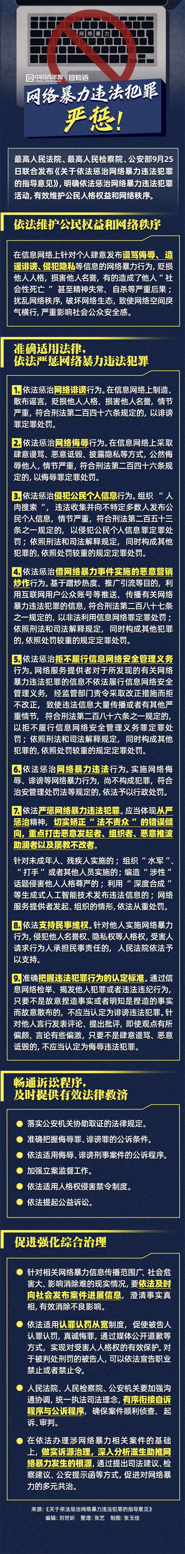 最高人民法院、最高人民检察院、公安部9月25日联合发布《关于依法惩治网络暴力违法犯罪的指导意见》。与传统犯罪行为不同,网暴受害人往往面临极高的维权成本。该意见明确从严惩治网暴行为,针对未成年人、组织“水军”、涉性等网暴行为从重处罚,切实矫正“法不责众”的倾向,维护公众安全感。拒绝网暴,依法维权。清朗网络秩序该如何维护,一起收藏了解。
