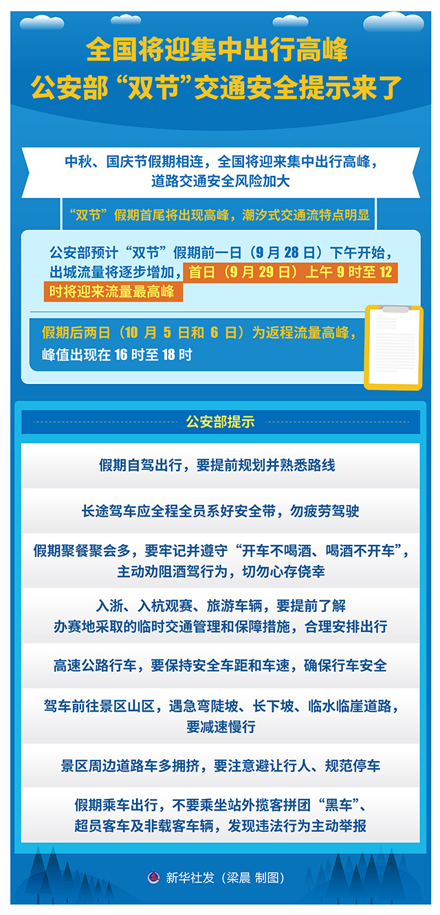 中秋、国庆节假期相连,全国将迎来集中出行高峰,道路交通安全风险加大。公安部分析研判近五年中秋、国庆节假期交通出行和交通事故规律特点,9月26日发布“双节”交通安全提示。