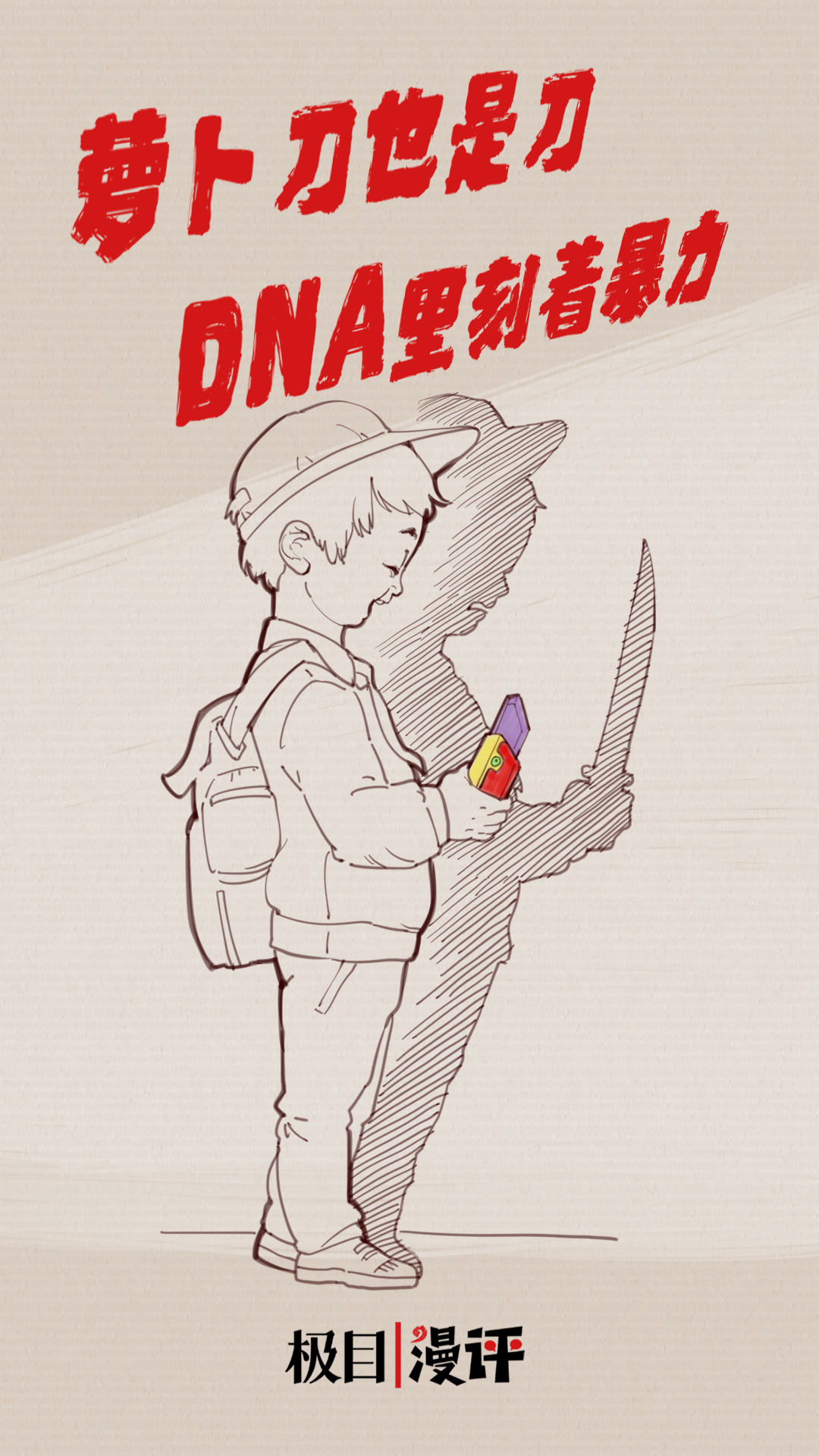 新京报评:孩子喜欢玩萝卜刀,把刀刃亮出来模拟切、割,看似只是为了好玩,而这折射出孩子潜意识里的暴力倾向。