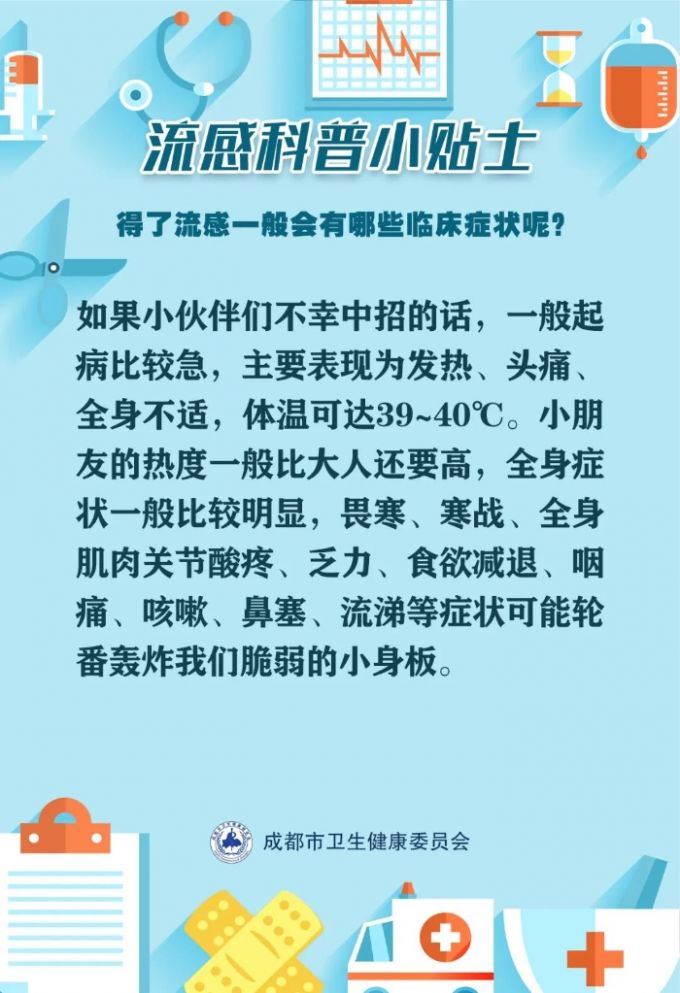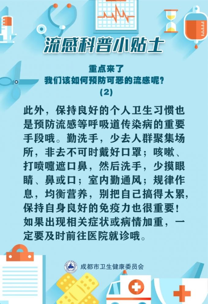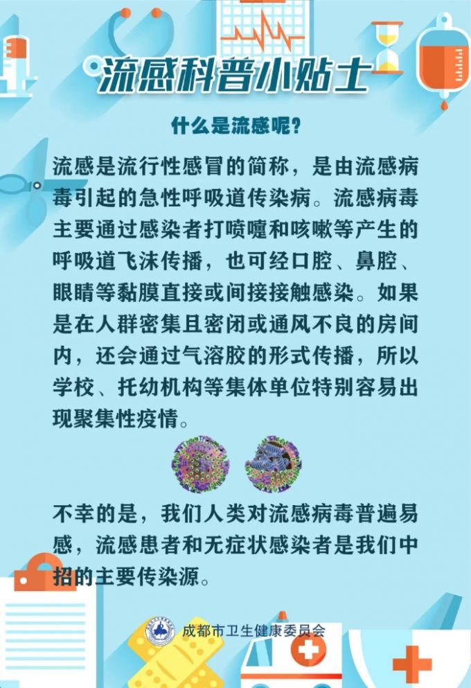 近日成都气温急剧下降,大家在防寒保暖的同时也要警惕流感、肺炎支原体等多种呼吸道病原体叠加流行的风险。特别是作为秋冬季呼吸道传染病高发病种之一的流感,小伙伴们一定要足够重视哦。什么是流感?如何正确地认识和预防流感呢?一起来看看流感科普小贴士吧↓↓↓