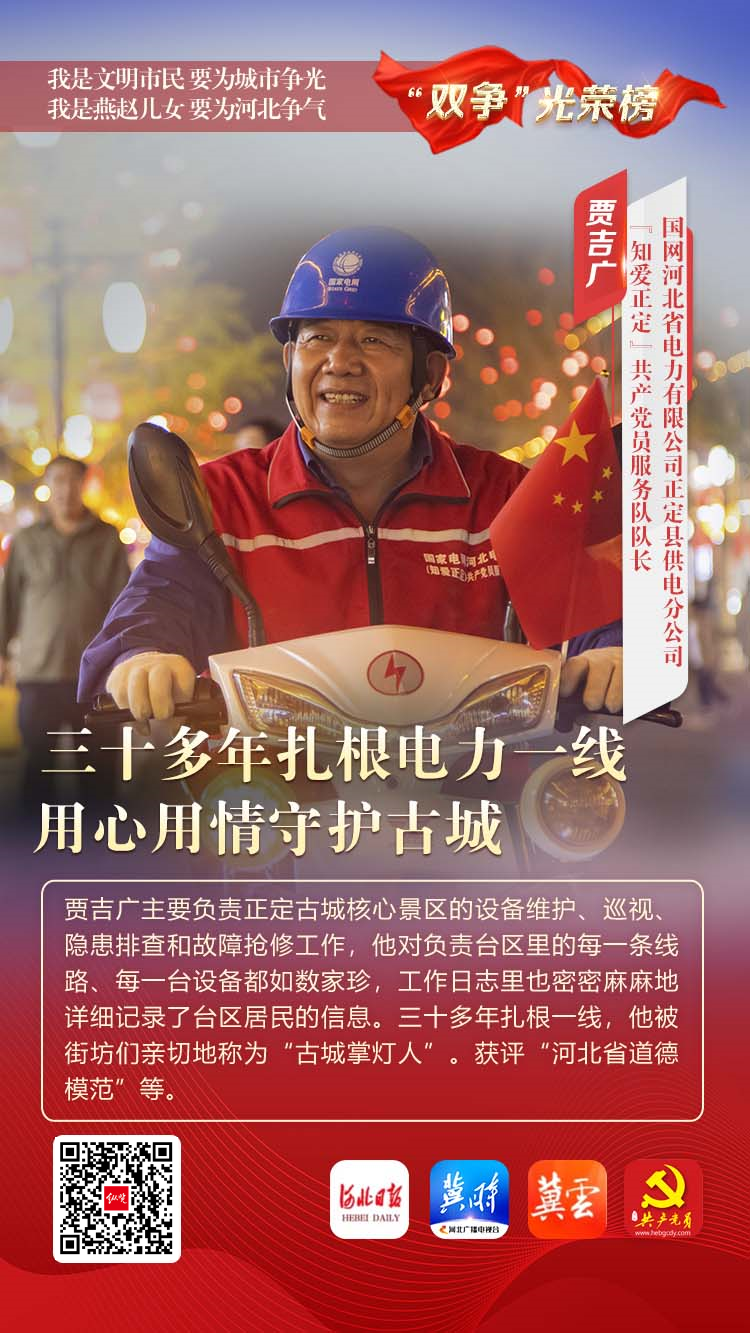 贾吉广主要负责正定古城核心景区的设备维护、巡视、隐患排查和故障抢修工作,他对负责台区里的每一条线路、每一台设备都如数家珍,工作日志里也密密麻麻地详细记录了台区居民的信息。三十多年扎根一线,他被街坊们亲切地称为“古城掌灯人”。获评“河北省道德模范”等。