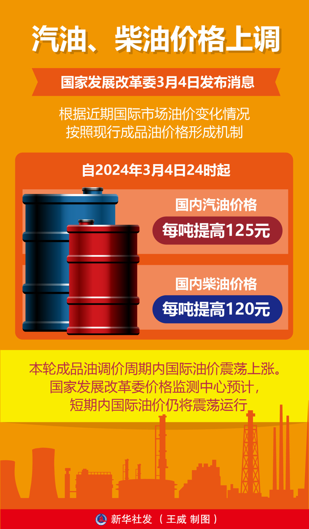 国家发展改革委3月4日发布消息,根据近期国际市场油价变化情况,按照现行成品油价格形成机制,自2024年3月4日24时起,国内汽油、柴油价格每吨分别提高125元、120元。