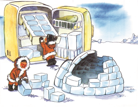 地球变暖让极地冰雪融化,人们居住的房屋坍塌。故此,急添冷冻设备制造冰块补充建材。漫画看似荒谬实为先见之明。