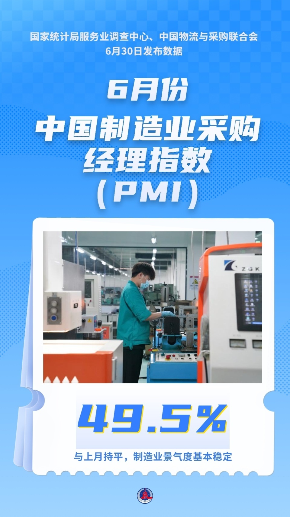 国家统计局服务业调查中心、中国物流与采购联合会6月30日发布数据,6月份,中国制造业采购经理指数(PMI)为49.5%,与上月持平,制造业景气度基本稳定。