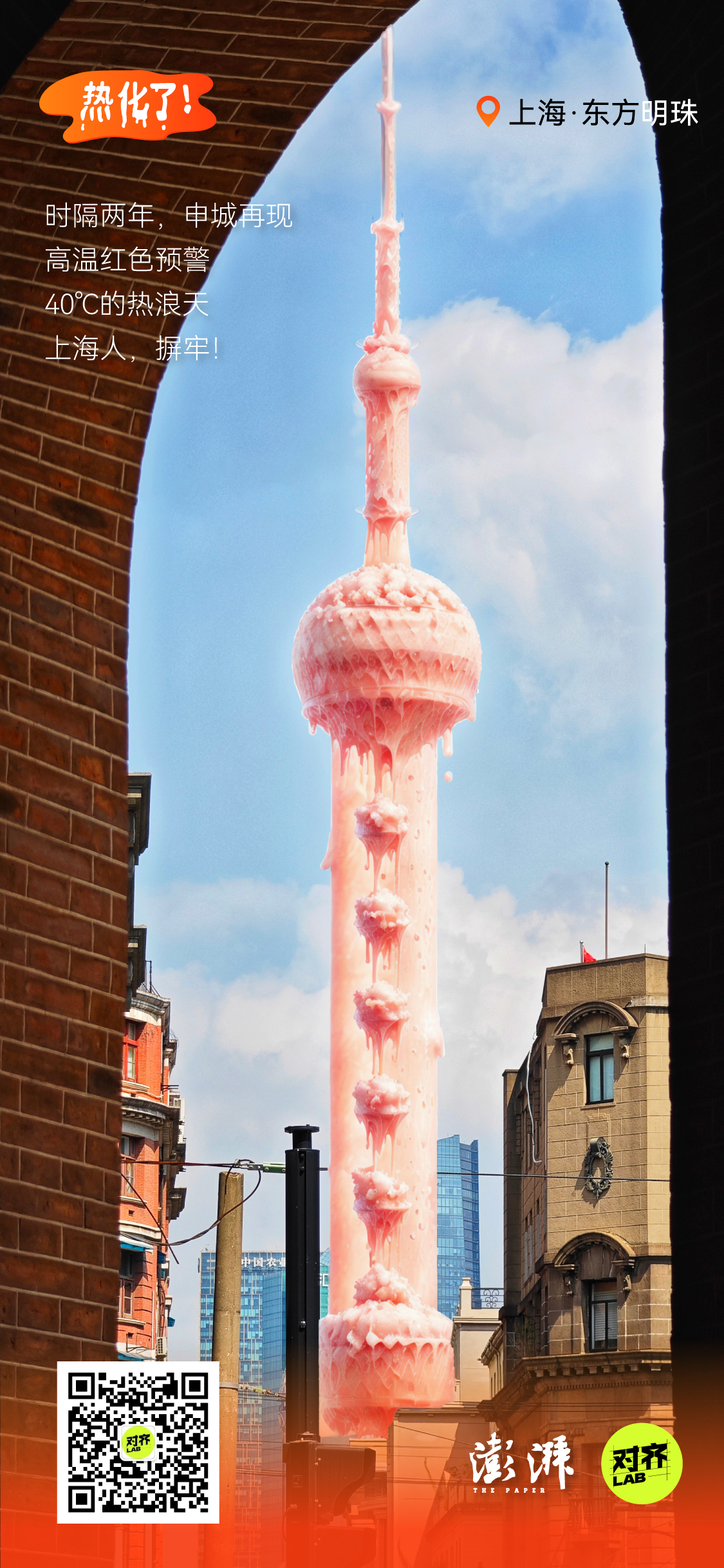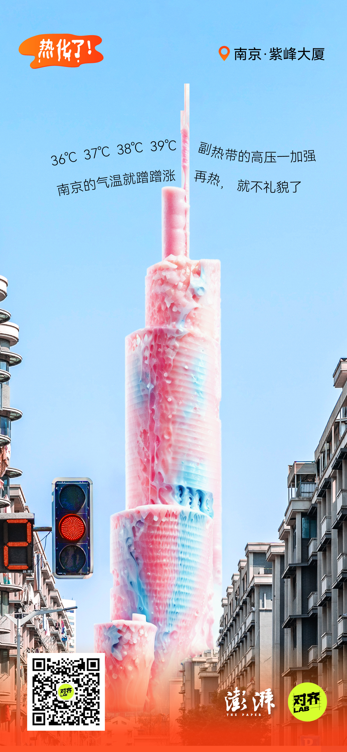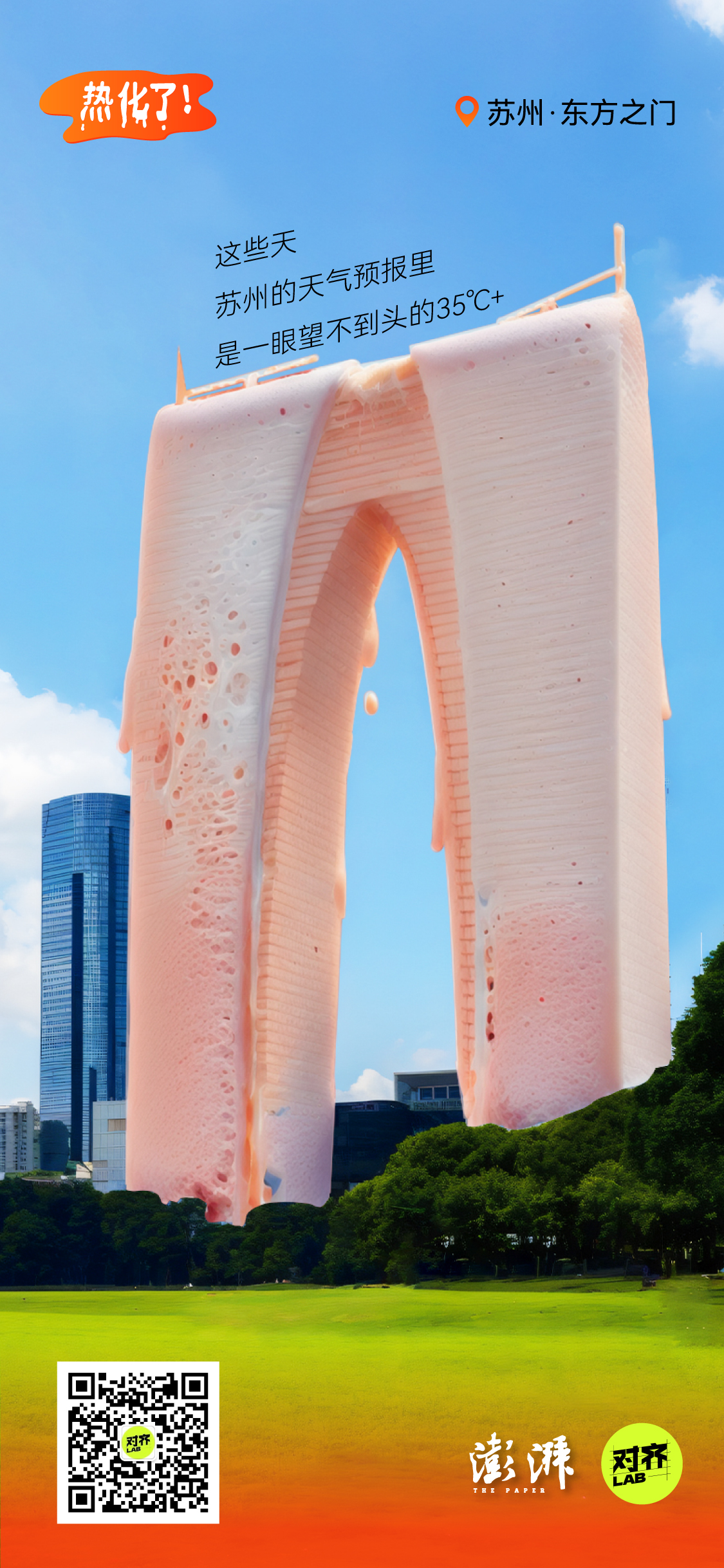 为了让高温具象化,我们借助AI,将城市地标做成了正在融化的雪糕: