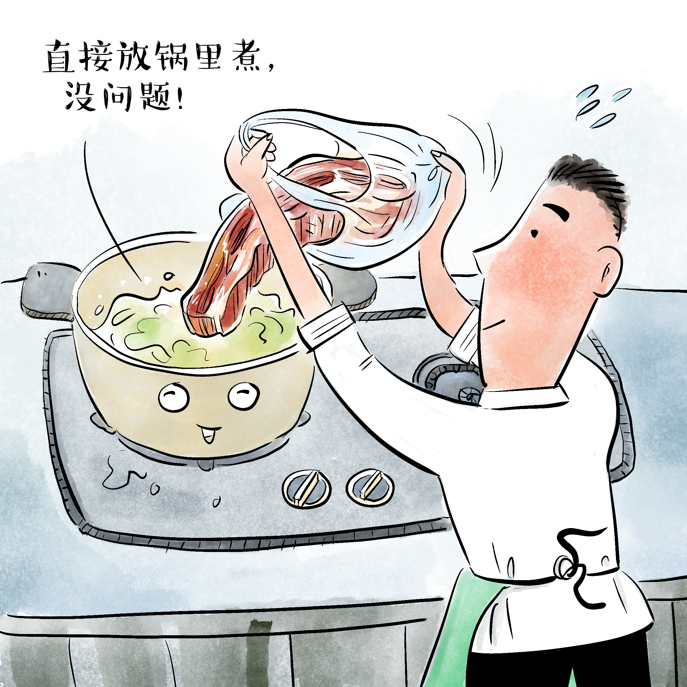 生肉往往都携带细菌,像是生鸡肉,还可能携带沙门氏菌等致病菌,但是如果直接拿水冲洗,飞溅的水花就会在你难以看见的情况下把致病菌带到厨房的各个角落。生肉买回家不清洗直接炖其实就是很好的除菌。如果需要清洗肉类,可以把它放进不流动的水中清理,洗干净后,用厨房纸巾进行薰干即可。另外,清洗完生肉,别忘了手和盛肉的器血都需要用洗涤剂进行清洗