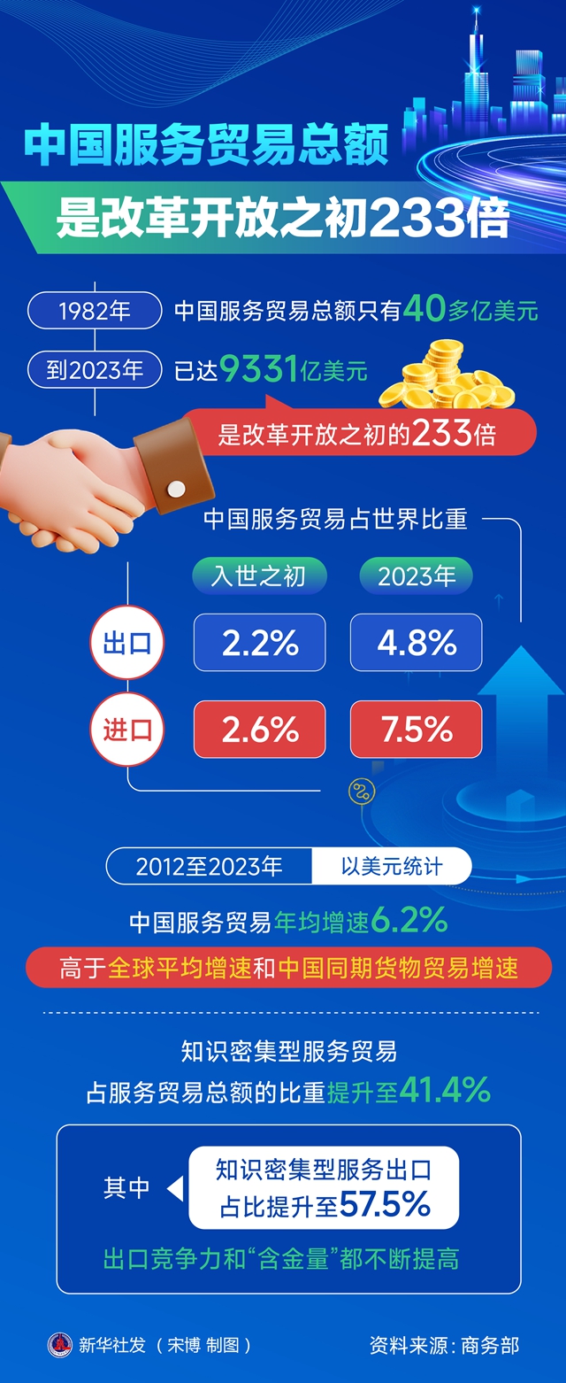 改革开放刚起步的1982年,中国服务贸易总额只有40多亿美元,到2023年已达9331亿美元,是改革开放之初的233倍。