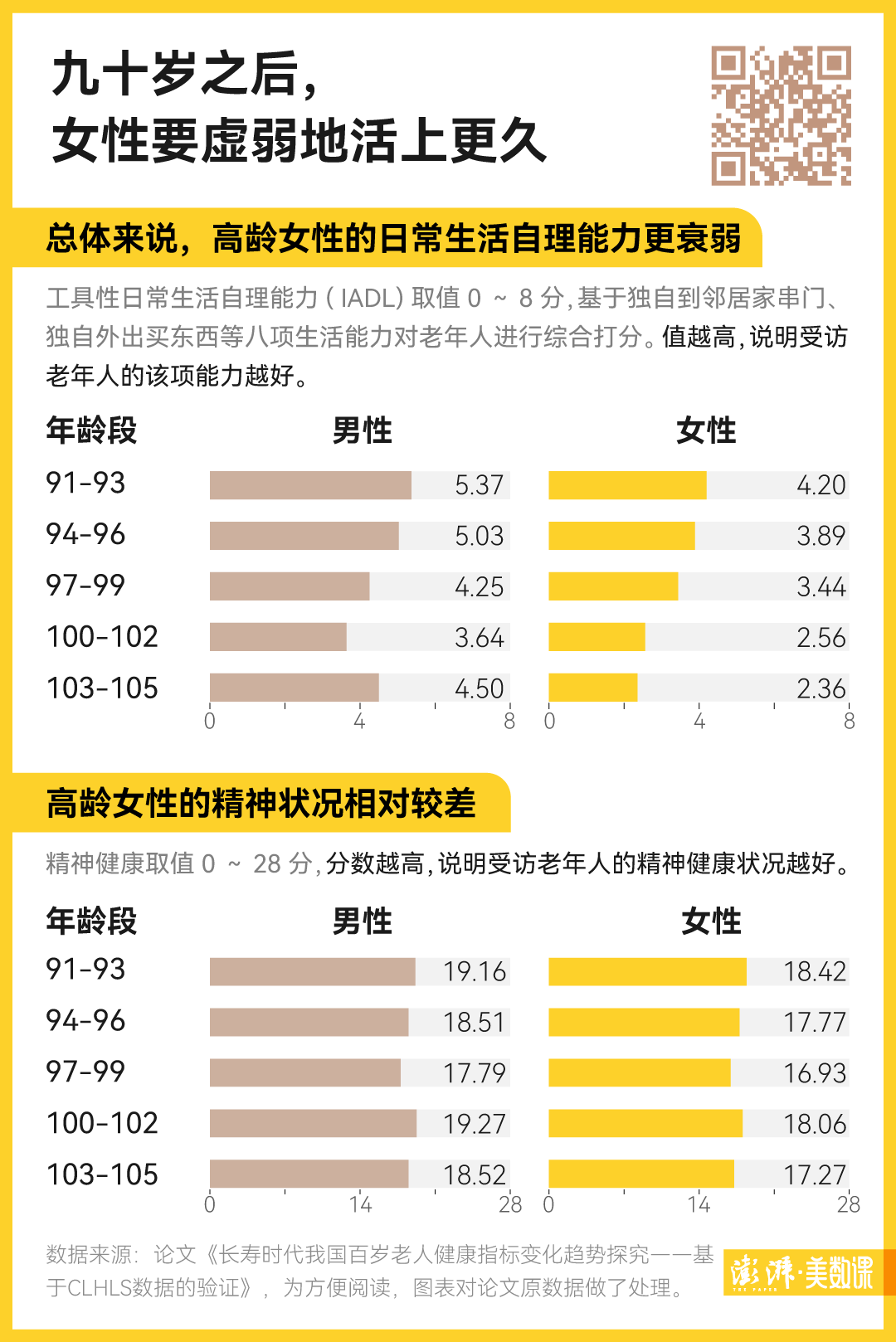 北京大学的一篇论文指出,虽然高龄老人和百岁老人群体中女性老人的比重大于男性,但男性老年人的健康状况总体上要好于女性老年人。CLHLS调查中评估了老年人的八项生活能力,如独自到邻居家串门、独自外出买东西等,为老年人的“工具性日常生活自理能力”进行综合打分,同时还评估了老人的精神健康。该论文对这些数据进行了综合分析,在控制了性别变量后发现,整体上女性高龄老人的健康状况要明显差于同一时期男性老人的健康状况,男性老人的身体状况和精神状况都更好。