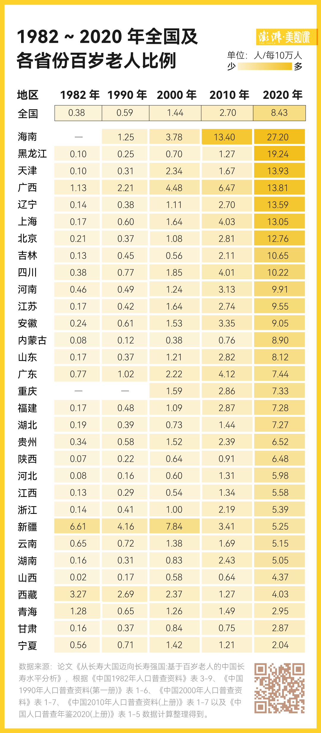 研究发现,2020年,全国每10万人中就有8.43个百岁老人。高于这个平均水平的13个省份中,东部地区占5个,东北地区占3个,西部地区占3个,中部地区占2个。其中,海南每10万人中百岁老人数量高达27.20人,居于首位,比第二名黑龙江高出约40%;排在后面的五个省份(天津、广西、辽宁、上海、北京)则紧凑地分布在同一个档位里,每10万人中有13至14位百岁老人。