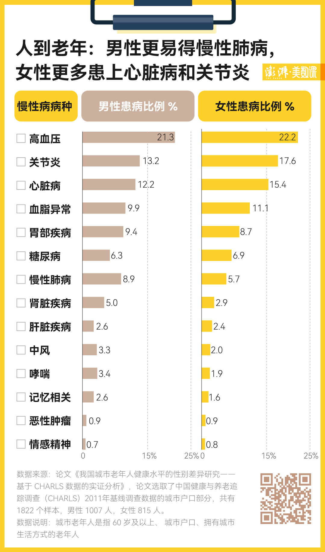 另一份北京大学社会学系的论文发现,城市老年人容易患的慢性病同样存在性别差异:男性更容易得慢性肺病(可能是男性更多有吸烟习惯的缘故),女性则更容易患上关节炎和心脏病。论文推测,这是因为女性大概率要兼顾家务劳动和关心家庭琐事。