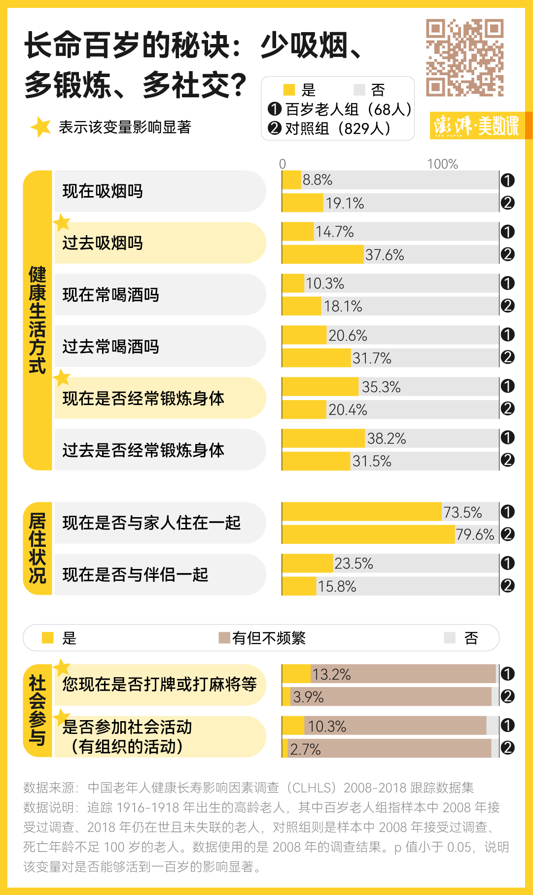 澎湃美数课选择了CLHLS2008-2018的跟踪数据集,来追踪1916年-1918年出生的高龄老人。2008年接受调查的这批老人中,有68人活到了一百岁以上,另外还有829人没能活到百岁以上。在下面的分析中,我们将这两类老人分别设为“百岁老人组”和“对照组”。