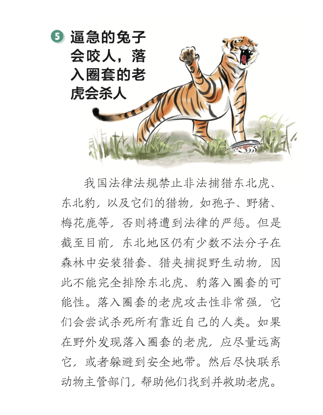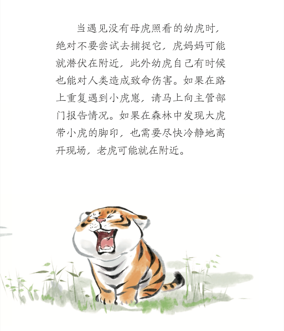 最近,东北虎豹国家公园管理局更新制作了《人兽冲突防范指导手册之遇到老虎怎么办?》。熊猫君把这个手册中的部分内容——如何避免与老虎相遇、与虎相遇后是啥情景、真的遇到老虎怎么办、今天我们该如何保护老虎等板块做成本期推文,分享给大家。