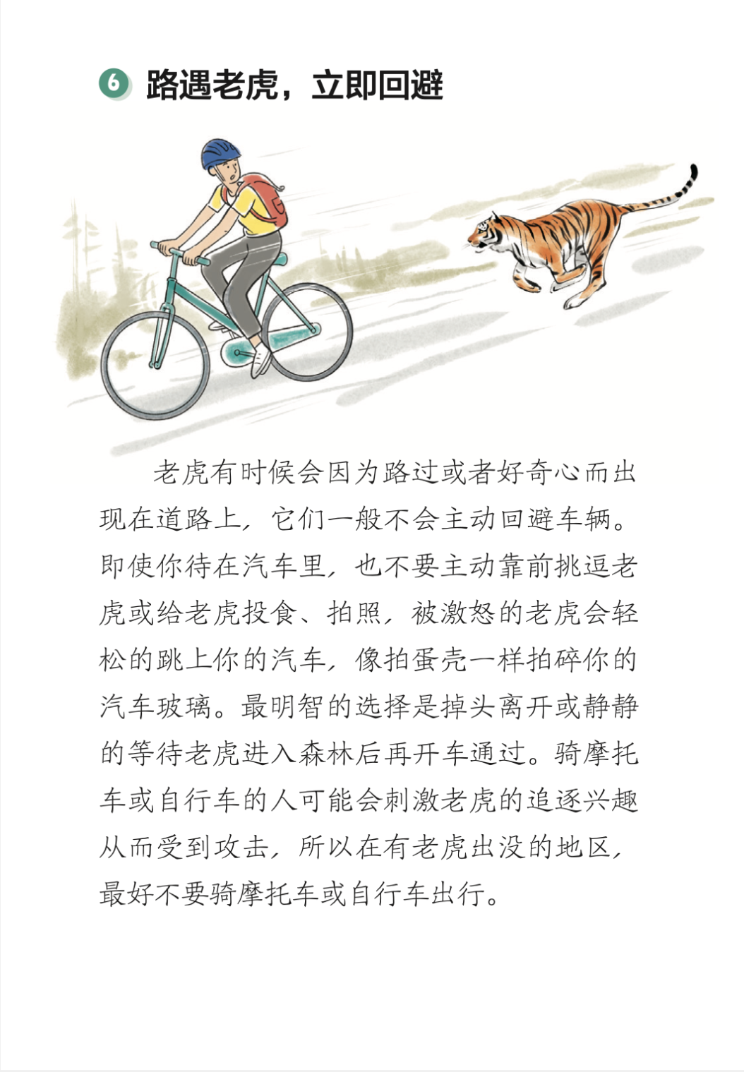最后,熊猫君提醒大伙儿,未经批准禁止擅自进入保护区核心区。如果在野外遇到老虎,需尽量保持头脑冷静,面向老虎缓慢撤离,万不可转身就跑。日常工作和旅行时,我们可能会有机会开车途经有野生动物出没的森林道路,请减速慢行;如果万一在开车时遇到老虎等猛兽,请关好门窗,尽量保持安静,缓慢开车离开,不打扰野生动物。并在保证自身安全的前提下,及时通知当地林业部门或拨打110通报情况。